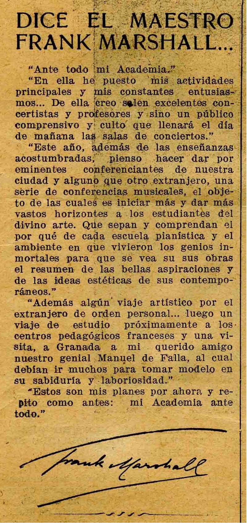 "Ante todo mi Academia. En ella he puesto mis actividades principales y mis constantes entusiasmos. De ella creo salen excelentes concertistat y profesores y sino un público comprensivo y culto que llenará el día de mañana las salas de los conciertos. Este año, además de las enseñanzas acostumbradas, pienso hacer dar por eminentes conferenciantes de nuestra ciudad, y alguno que otro extranjero, una serie de conferencias musicales, el objetivo de las cuales es iniciar más y dar más vastos horizontes a los estudiantes del divino arte. (...). Estos son mis planes por ahora y repito como antes: mi Academia ante todo." FRANK MARSHALL